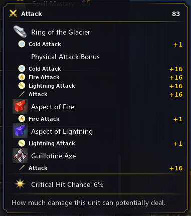 Hey, is it WAD that physical attack boni apply separately, indiscriminately and quite bountifully to each type of attack? My henchman Warrior (+3) has three Lethal abilities (+12) and additional banner bonus from a friendly Commander (+1), for a total of +16 attack bonus. I equipped him with a melee weapon and three trinkets adding +1 different elemental damage type each. The calculation is: