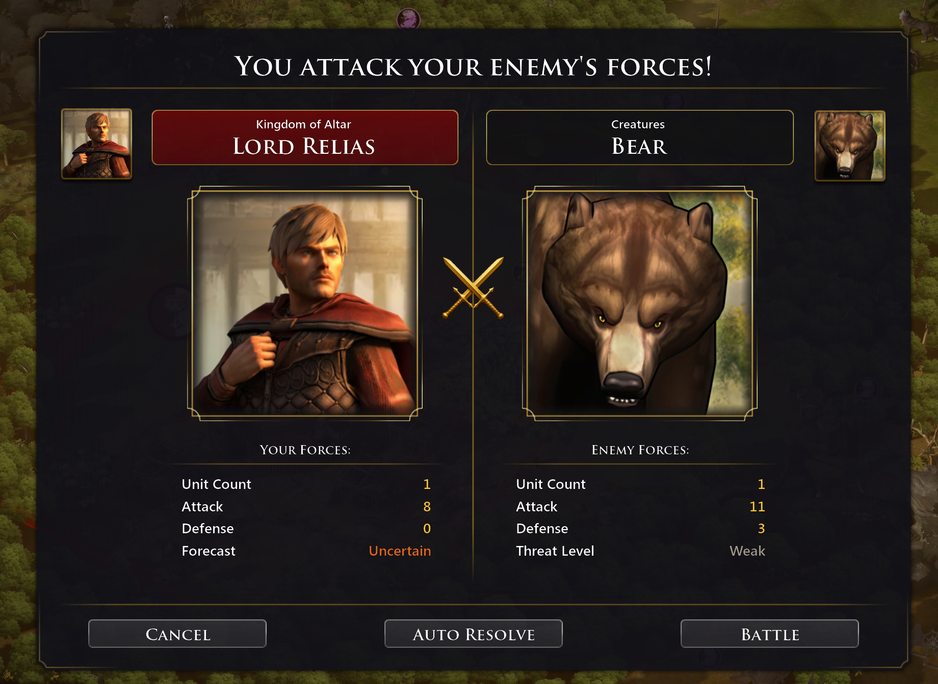 The biggest addition is a new battle forecast system. The pre-battle screen now shows a predicted outcome before you commit to a fight, ranging from Crushing Victory down to Likely Defeat, color-coded green to red. If your champions are at risk of falling, it tells you.